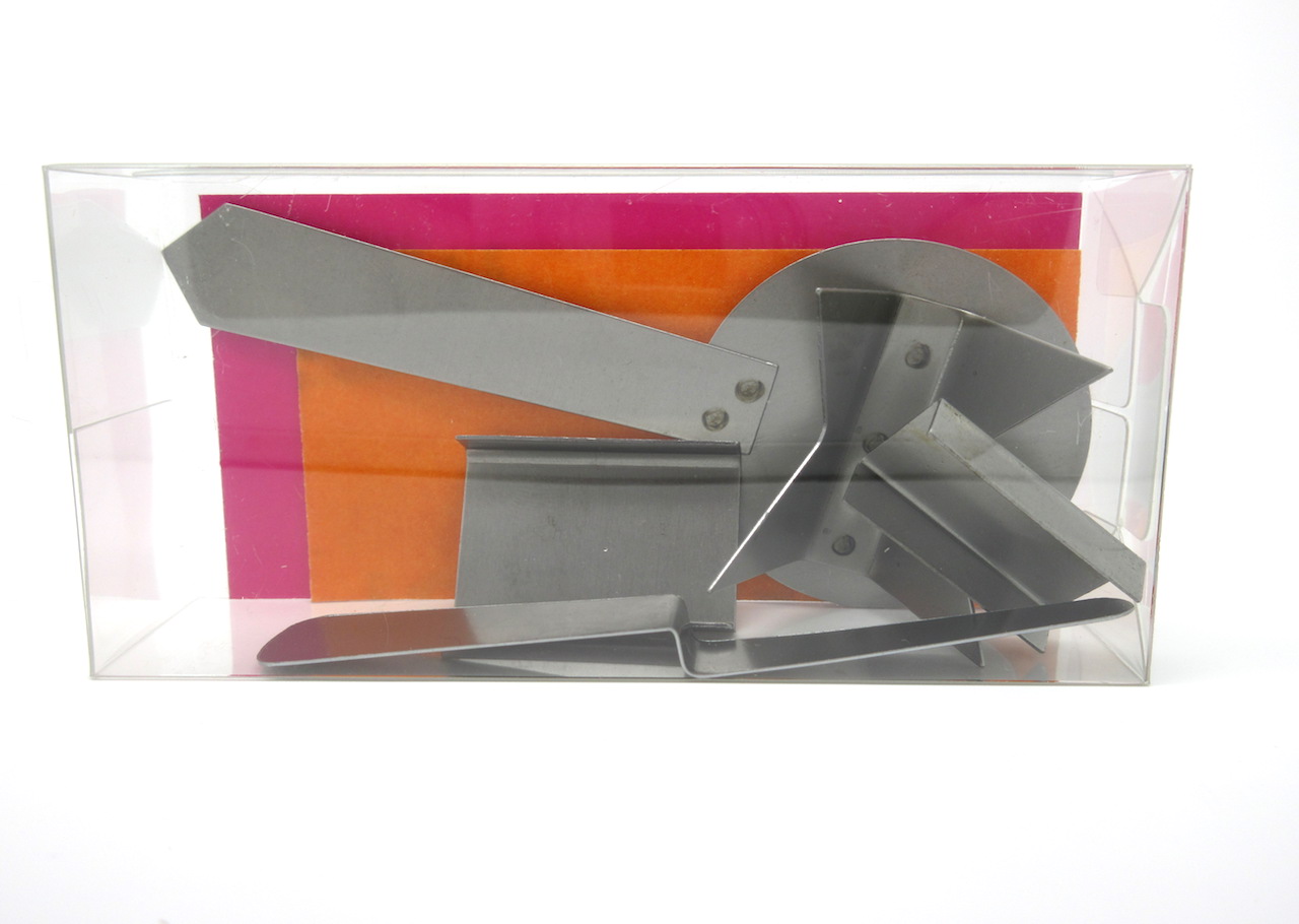Kit attrezzi per smalti a fuoco. Il kit si compone di 5 pezzi: carta abrasiva, due basi d’appoggio per smaltare, palettina per sollevare i pezzi dal piano di appoggio, base in metallo per infornare i pezzi. Dimensioni della confezione: 11×5,5cm. Se desiderate smaltare il retro dell’oggetto usate la placchetta che va in forno dalla parte delle stanghette ovvero con la parte piatta poggiata sul piano del forno.